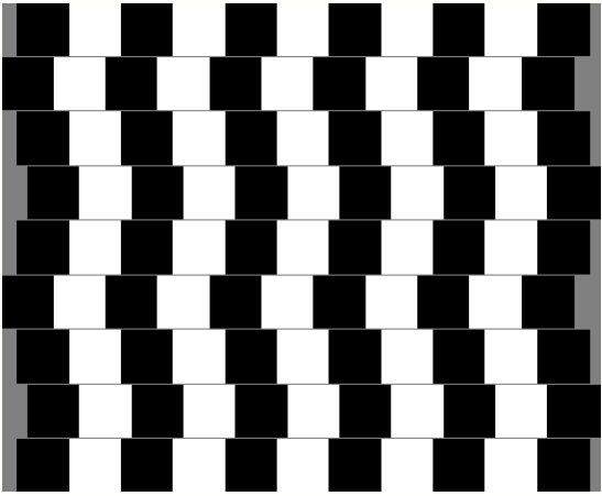 Ends the TikZ environment. The result is a staggered tile pattern that produces a strong illusion of curved or slanted lines.